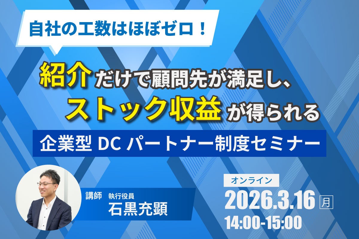 社会保険労務士法人とうかいのグループ企業、株式会社日本企業型確定拠出年金センター(名古屋市)は2026年3月16日14時から、税理士・社労士・保険代理店向けに「企業型DCパートナー制度セミナー」をZoomで開催します。参加費は無料です。紹介のみで実務を委任でき、継続報酬でストック収益を得る仕組みを解説します。