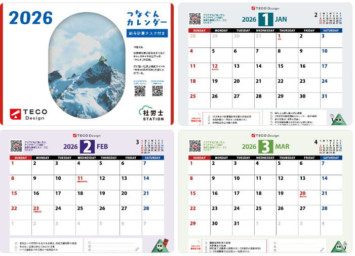 配布物:給与計算タスク付き 2026年つなぐんカレンダー