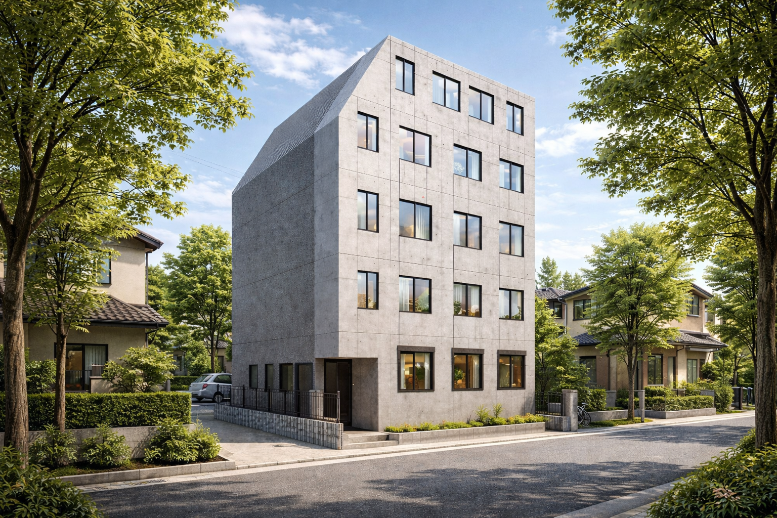構造は壁式RC造で、柱や梁の出っ張りを抑えやすく、専有部の面積効率を高められる点が特徴です。外観・共用部はコンクリート打ち放しを基調とし、間取りは1LDKと2LDKで幅広い入居ニーズを想定しています。
