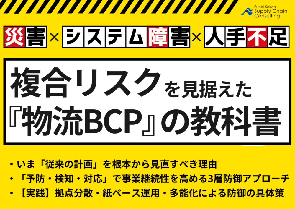 船井総研サプライチェーンコンサルティング(東京都中央区)は2026年3月、資料「災害×システム障害×人手不足 複合リスクを見据えた『物流BCP』の教科書」を無料で公開しました。製造・卸・小売の経営層や物流責任者、SCM担当者の利用を想定します。