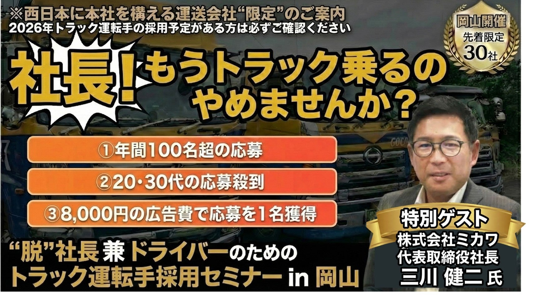 対象は運送会社の経営者・幹部で、「社長がトラックに乗るしかない」状態からの脱却と、ドライバー採用の改善を狙います。西日本エリアで強い採用難が続く中、ドライバーから選ばれる会社づくりをテーマに据えます。