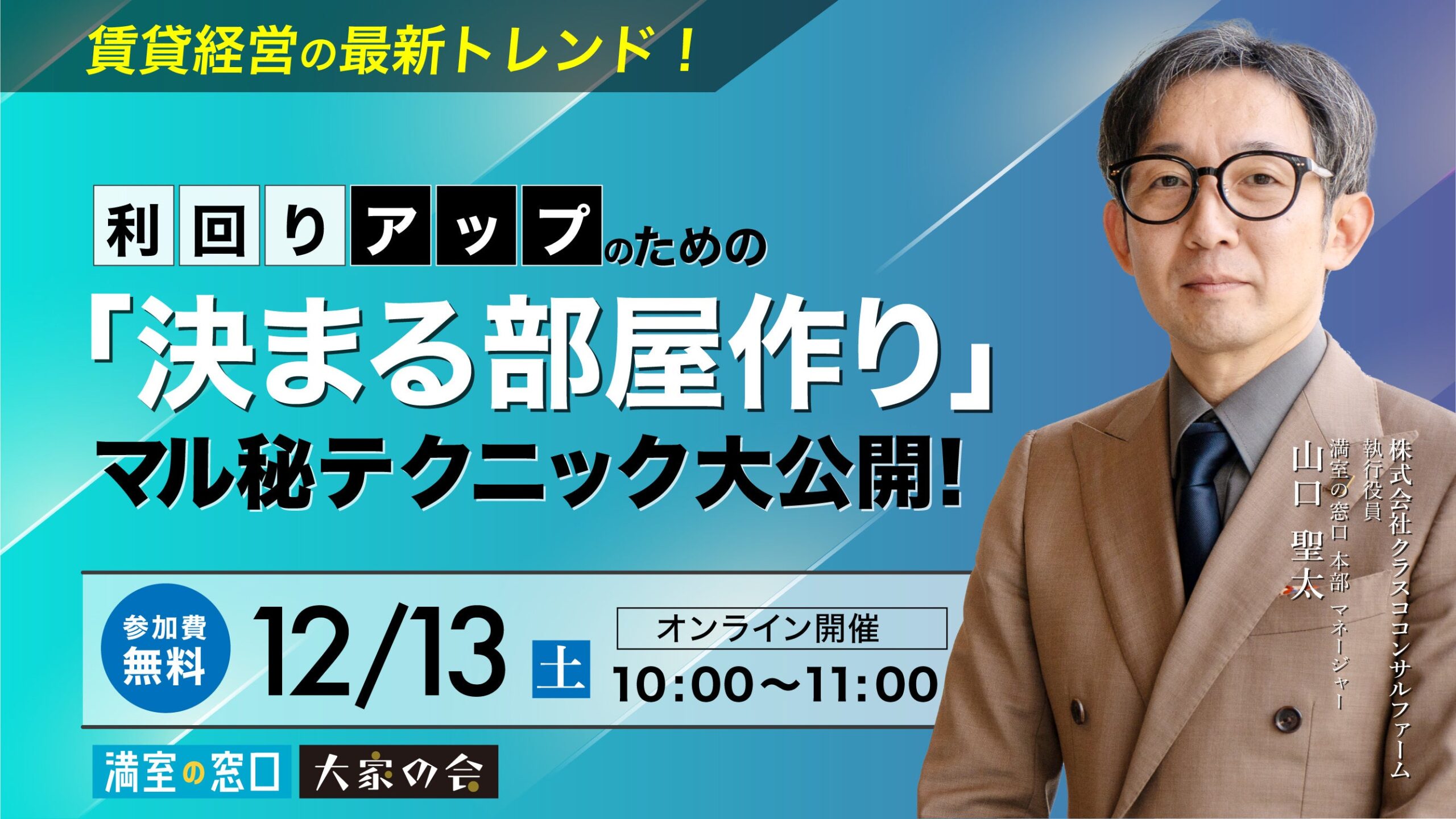 全国の不動産オーナー向けに、利回り向上と空室対策をテーマにした無料オンラインセミナーが12月13日10:00〜11:00に実施されます。定員は先着100人、参加費は無料。講師は山口聖太氏(満室の窓口 本部・執行役員)で、「決まる部屋作り」の具体策を1時間で解説します。