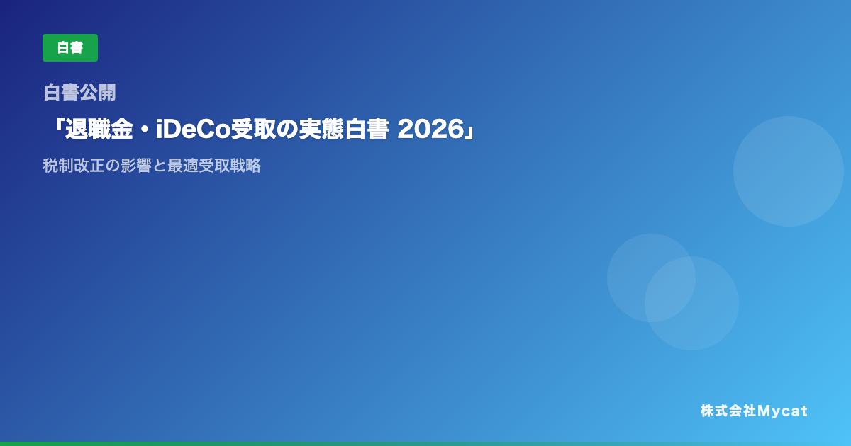 株式会社Mycat(東京都目黒区)は3月25日、退職金とiDeCoの受取方法を整理した資料「退職金・iDeCo受取の実態白書 2026」(全34ページ)を無料公開した。2026年税制改正で退職所得控除の重複適用期間が「5年から10年」に変わる点を踏まえ、改正前後の手取り差を条件別に試算している。