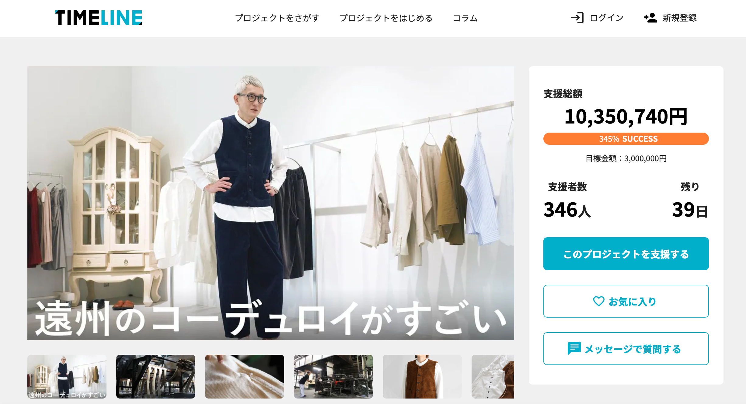 遠州産コーデュロイ「コール天」を支えるクラウドファンディングが支援総額1,000万円超となりました。実施はHUISとエブリーのTIMELINEで、募集は2026年1月12日17時59分までです。限定ベスト(各色・各サイズ20点)やパンツ4型などをリターンに用意しています。