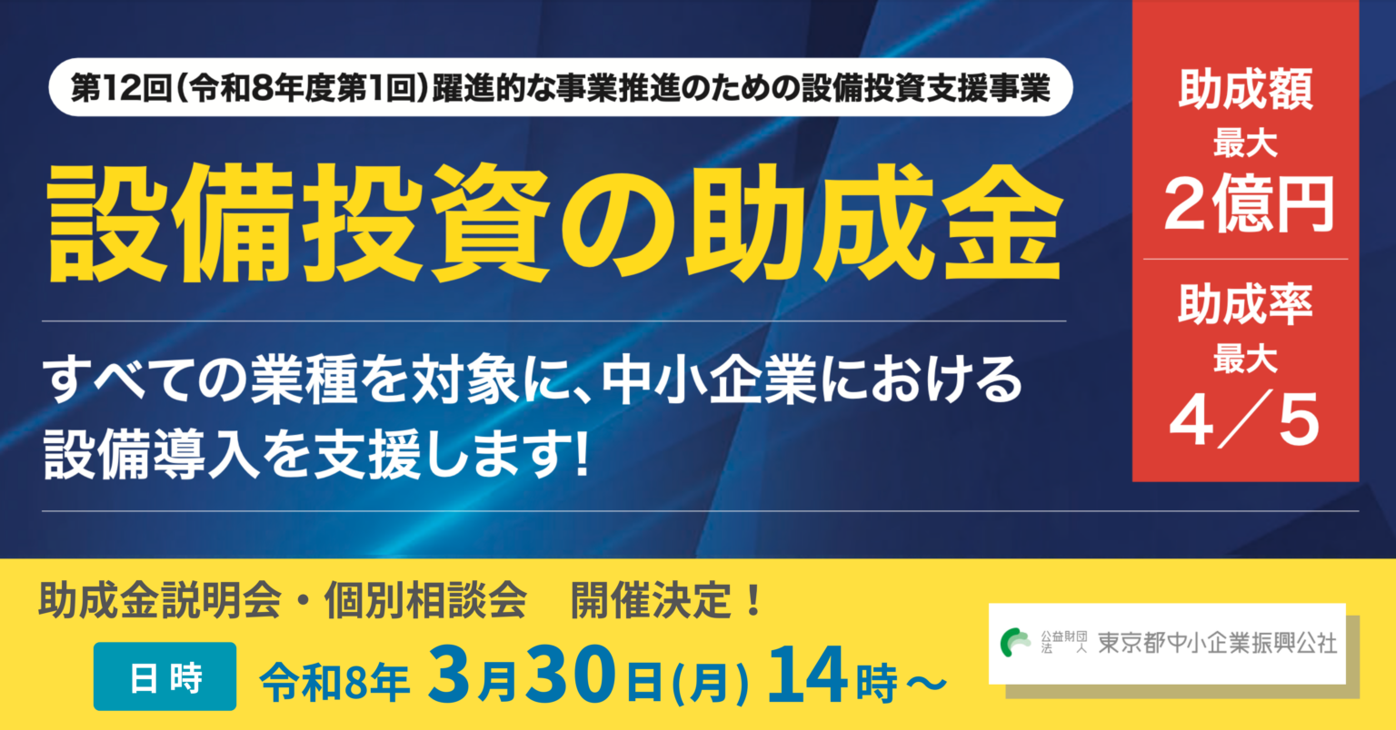 東京都中小企業振興公社は、都内中小企業者等の設備投資を支援する「第12回(令和8年度第1回)躍進的な事業推進のための設備投資支援事業」の申請受付を始めます。助成額は100万円〜最大2億円、助成率は最大4/5以内です。申請期間は令和8年4月21日9時から4月30日17時までです。