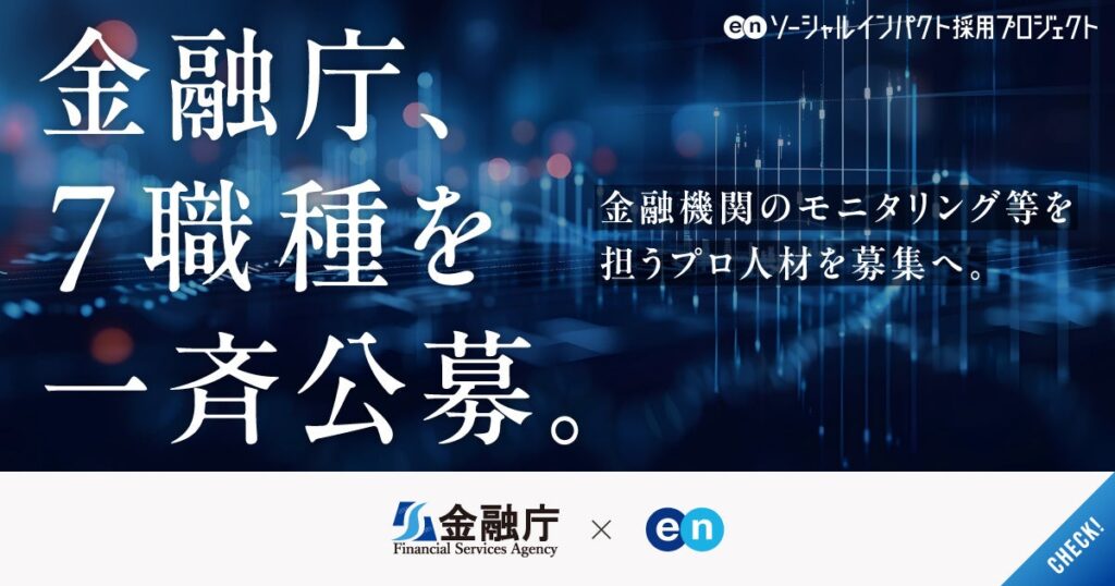 金融庁は1月22日、採用支援サービスを運営するエンと連携し、「ソーシャルインパクト採用プロジェクト」で金融機関のモニタリングなどを担う7職種の一斉公募を始めました。応募受付は3月18日までです。