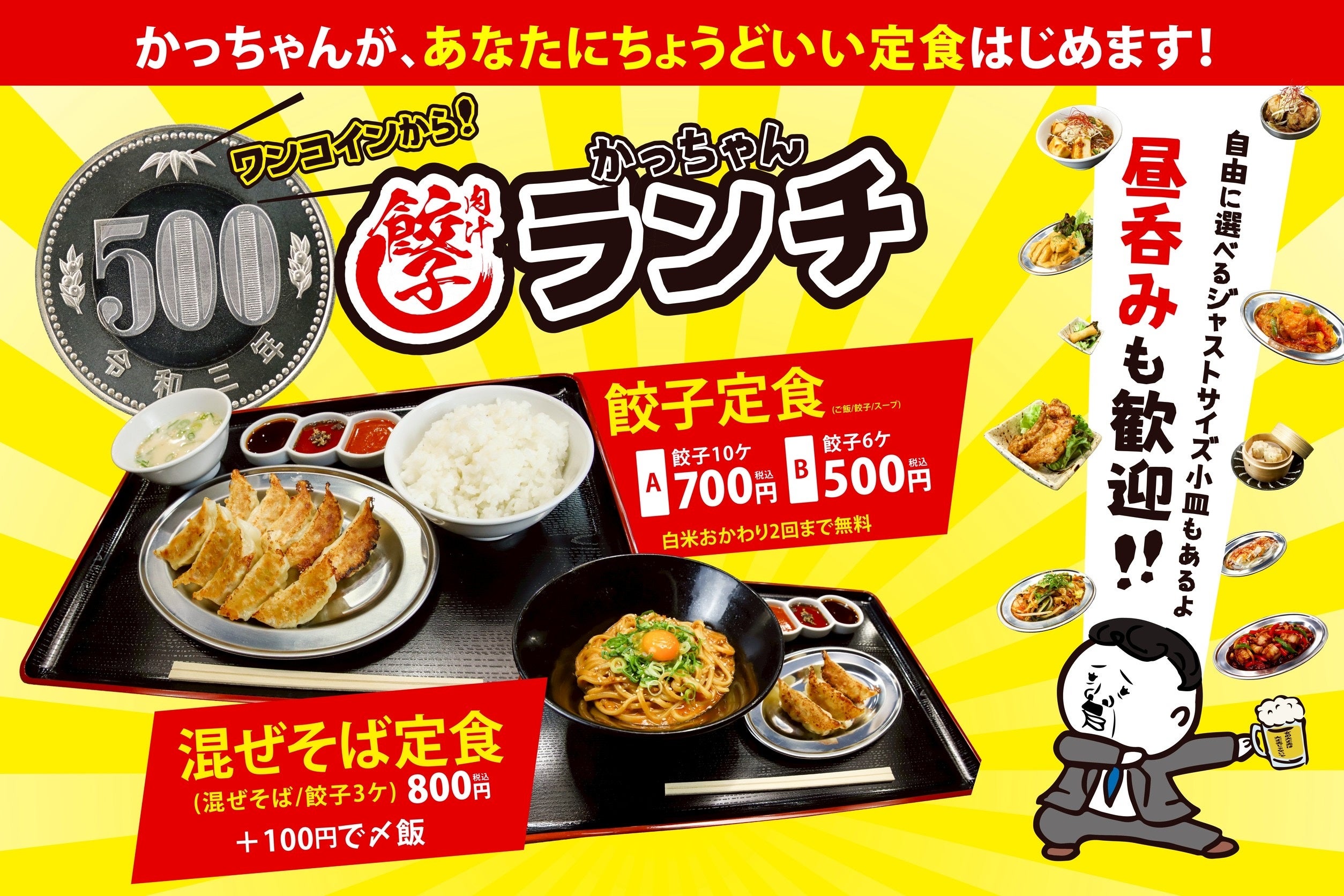 飲食店「肉汁製作所 餃子のかっちゃん」は2026年3月24日、大阪・名古屋の対象4店舗でランチ営業を本格的に始めます。主力は餃子6個の定食を税込500円で提供し、対象は大阪駅前第二ビル店、十三店、塚本店、新瑞橋店です。