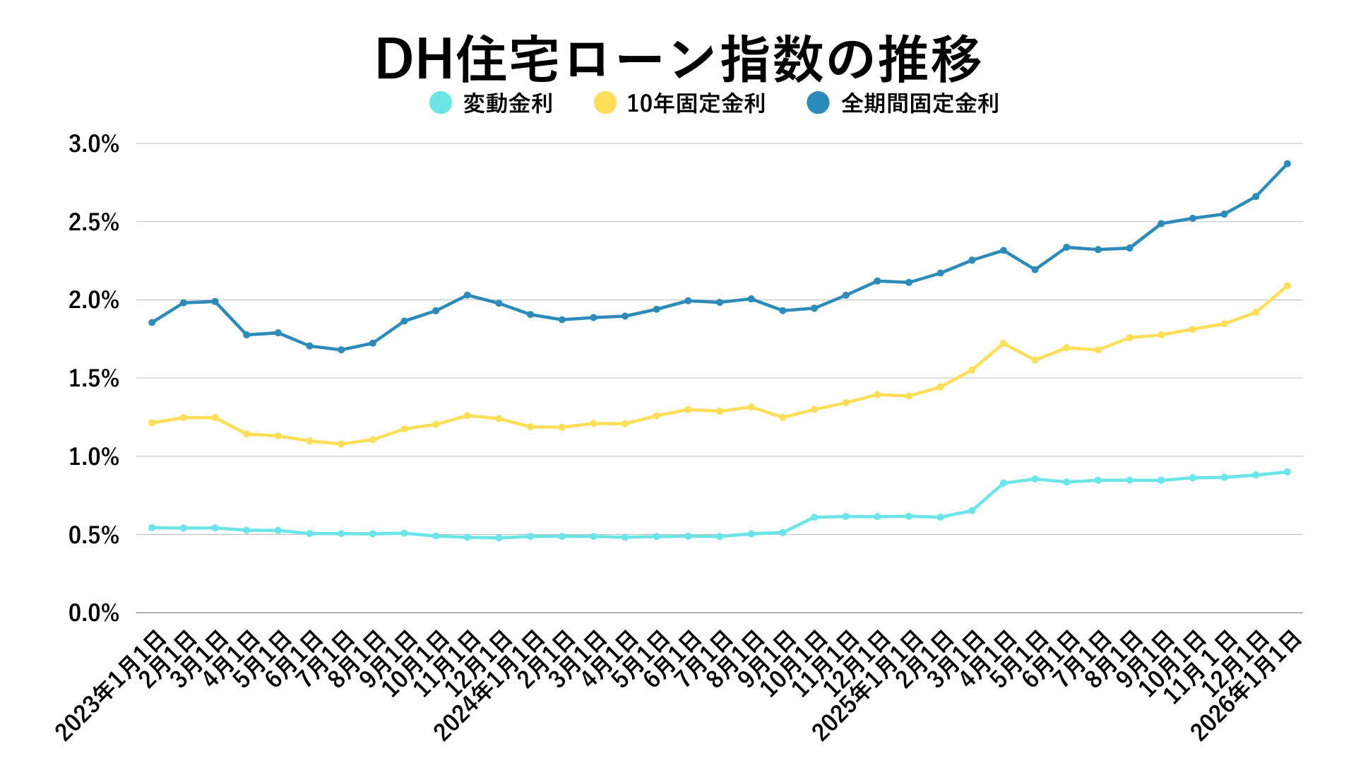 金利面では、10年固定が2.086%(前月1.916%、前年同月1.385%)、全期間固定が2.868%(前月2.664%、前年同月2.111%)と上昇しました。指数は13行の金利を基に算出され、低水準例としてauじぶん銀行の10年固定1.505%も挙げています。メガバンクは短期プライムレートを0.25%引き上げ2月から適用予定で、春以降に上昇が広がる可能性があるとしています。