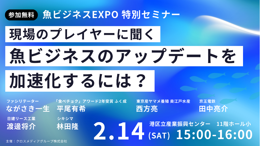 クロスメディアグループは、2026年2月14日15時から、港区立産業振興センター(港区)11階ホール小で「魚ビジネスEXPO 2026」のスペシャルセミナーを開きます。参加費は無料で、登壇者は5名です。