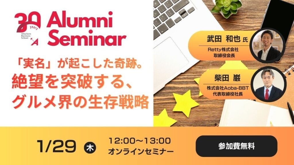 Aoba-BBTが運営するアタッカーズ・ビジネススクール(ABS)は2026年1月29日、Retty創業者で同社取締役会長の武田和也氏を招いた特別対談セミナーをオンラインで開きます。時間は12時〜13時で、参加費は無料です。対談相手はAoba-BBT代表取締役社長の柴田巌氏です。