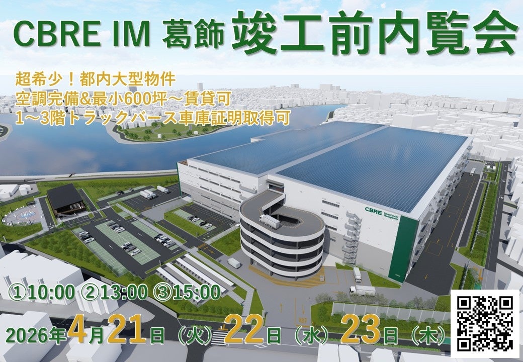 CBREインベストメントマネジメント・ジャパン(東京・千代田)は、2026年9月竣工予定のマルチテナント型物流施設「(仮称)CBRE IM葛飾」(東京・葛飾区奥戸1-29)で、竣工前内覧会を2026年4月21〜23日に実施します。各日①10時②13時③15時の3枠で、所要時間は約60分です。