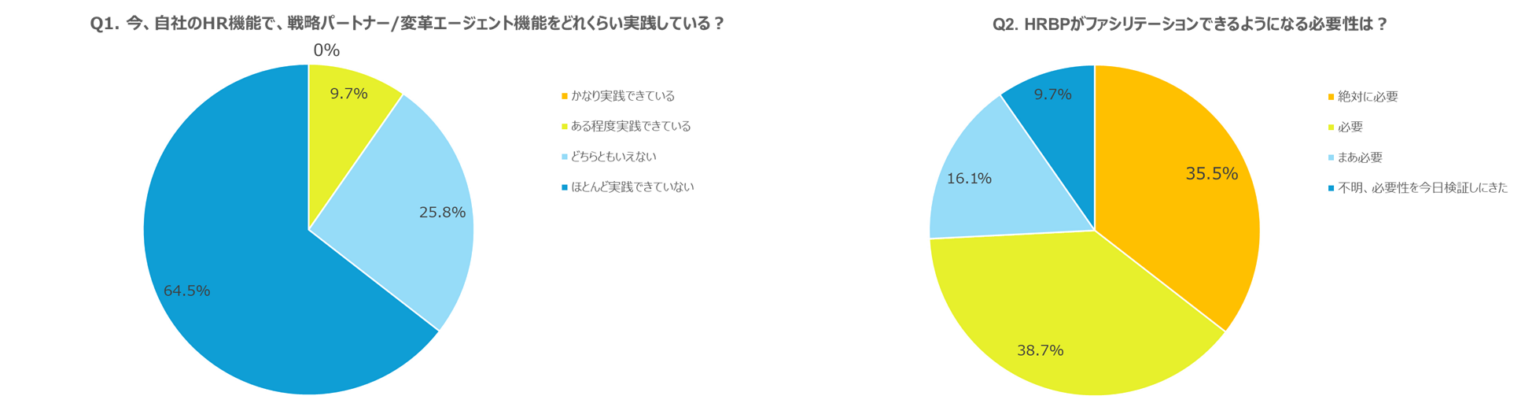 講演はHRBP(Human Resources Business Partner)が事業に関与するためのスキルとしてファシリテーション(合意形成や議論を前に進める進行技術)の重要性を扱い、必要性については「絶対に必要」35.5%、「必要」38.7%で計74.2%が肯定しました。一方で「不明、必要性を今日検証しにきた」も9.7%あり、役割との結びつきが浸透していない可能性が示されました。満足度は「満足」45.0%、「ほぼ満足」50.0%で肯定的回答が95.0%でした。