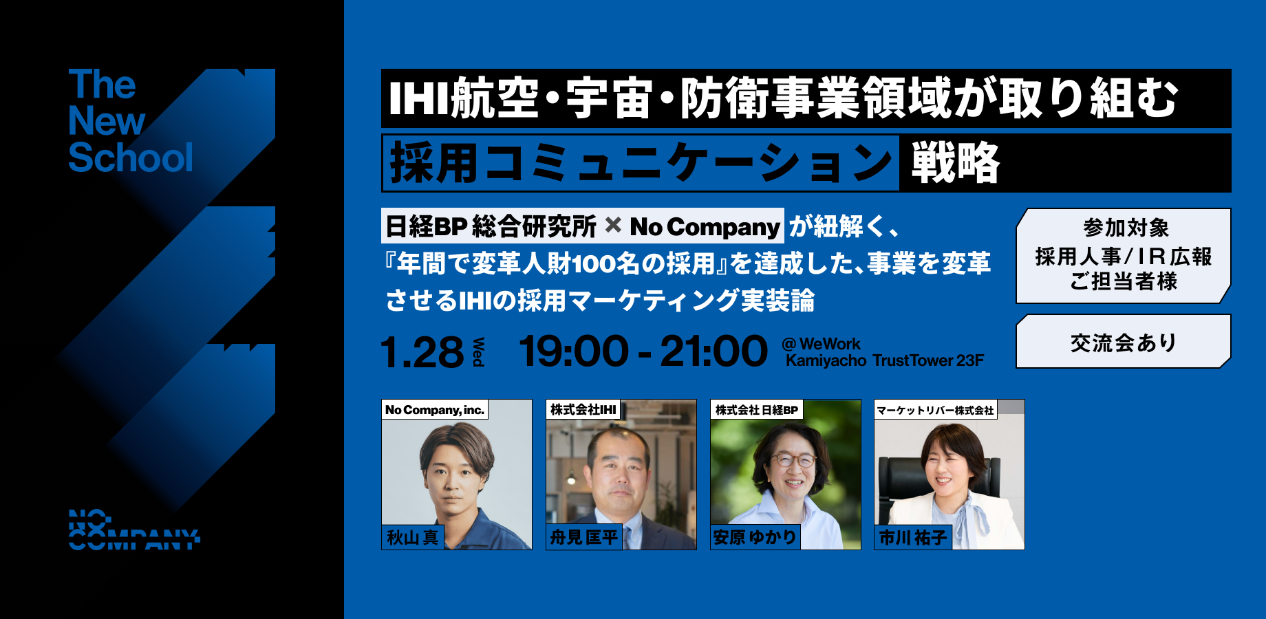 No Companyは2026年1月28日19時〜21時、IHIの航空・宇宙・防衛事業領域が1年間で「変革人財100名」の採用を達成した採用コミュニケーション戦略をテーマにした人事・採用広報担当者向けイベントを東京都港区で開きます。参加費は無料です。登壇はIHIの舟見匡平氏、日経BP総合研究所の安原ゆかり氏、マーケットリバーの市川祐子氏ら。IHIが漫画『宇宙兄弟』とのコラボやSNS広告などデジタル施策を用い、BtoBメーカーが直面しやすい「知名度はあるが実態が知られていない」課題をどう補ったかを扱います。加えて、面接官トレーニングなど現場の抵抗を抑える組織風土変革、人的資本経営の観点から採用と株式市場評価の関係も議論します。採用難ポジションの打開や採用人数拡大を検討する企業にとって、手法の再現可能性が焦点になりそうです。