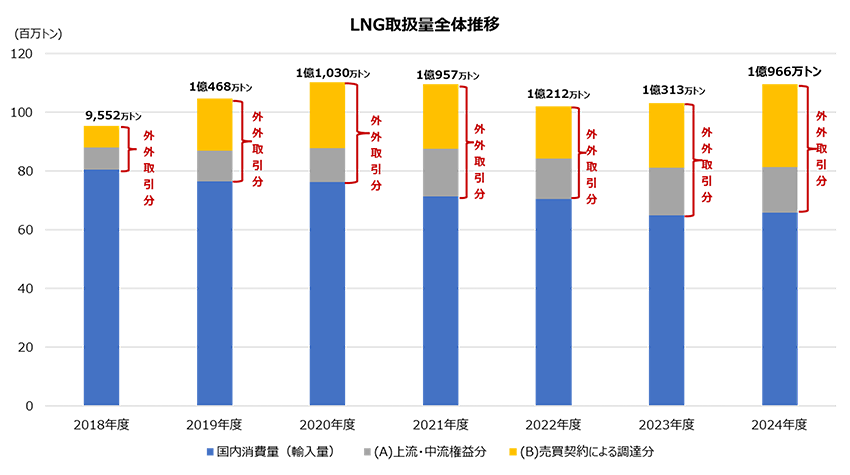 JOGMECは2月18日、日本企業のLNG取扱量調査と、LNG売買契約における仕向地条項(仕向地制限)や価格指標などの実態調査について、2025年度調査結果を公表しました。2024年度の日本企業のLNG取扱量は、およそ1億1,000万トンでした。