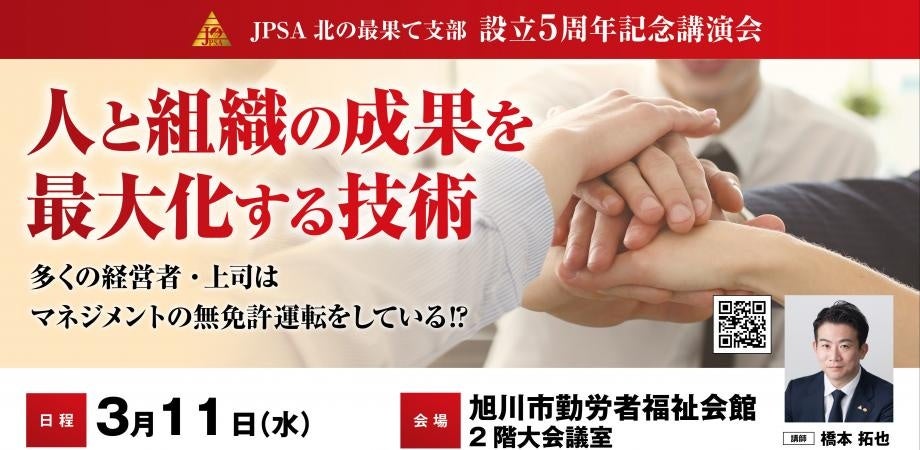 一般財団法人日本プロスピーカー協会(JPSA)北の最果て支部は、設立5周年の記念特別講演会を2026年3月11日19時から旭川市勤労者福祉会館で開きます。講師はアチーブメントの橋本拓也氏で、定員は先着300人、参加費は3,000円です。北海道内から経営者や企業幹部など200人超の参加を見込んでいます。