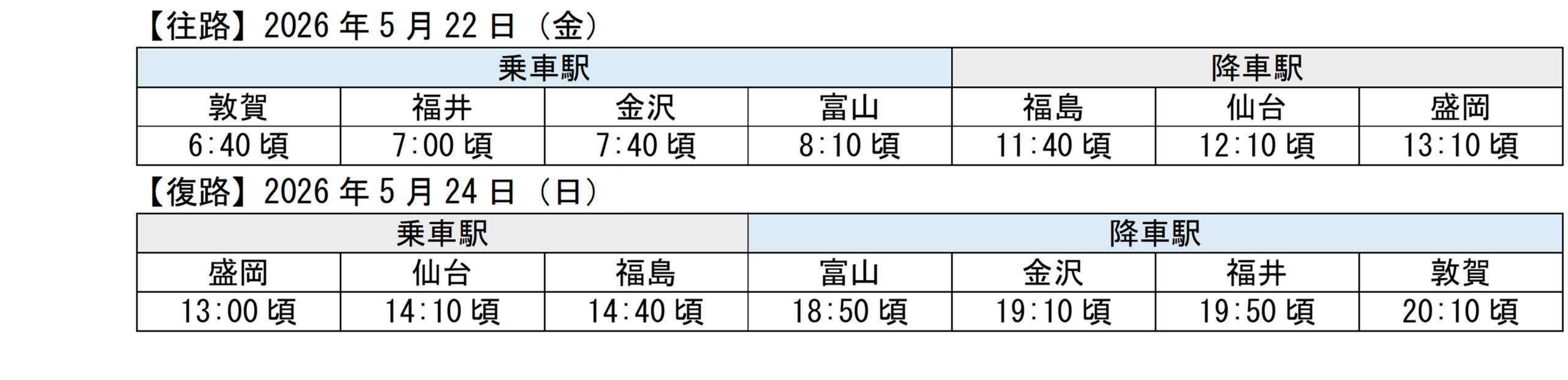 JR西日本とJR東日本は、北陸~東北間を乗り換えなしで結ぶ団体専用の臨時直通新幹線を運転します。設定する列車は2本で、敦賀発・盛岡行きの「つながる東北」号と、盛岡発・敦賀行きの「つながる北陸」号です。北陸→東北の直通は7年ぶりで5回目となり、北陸新幹線の敦賀~金沢間が2024年3月16日に開業して以降では初めてです。東北→北陸の直通は1年ぶりで6回目となります。停車駅や時刻は旅行会社の旅行商品設定により異なる場合があるものの、敦賀~黒部宇奈月温泉間の各駅に加え、郡山駅と一ノ関駅にも停車する予定です。停車駅と時刻は変更となる可能性があります。利用方法は旅行会社が販売する専用旅行商品に限定され、発売の詳細は別途案内されます。今後、商品内容や運転日などの具体化により、北陸・東北間の周遊需要をどこまで取り込めるかが焦点になりそうです。