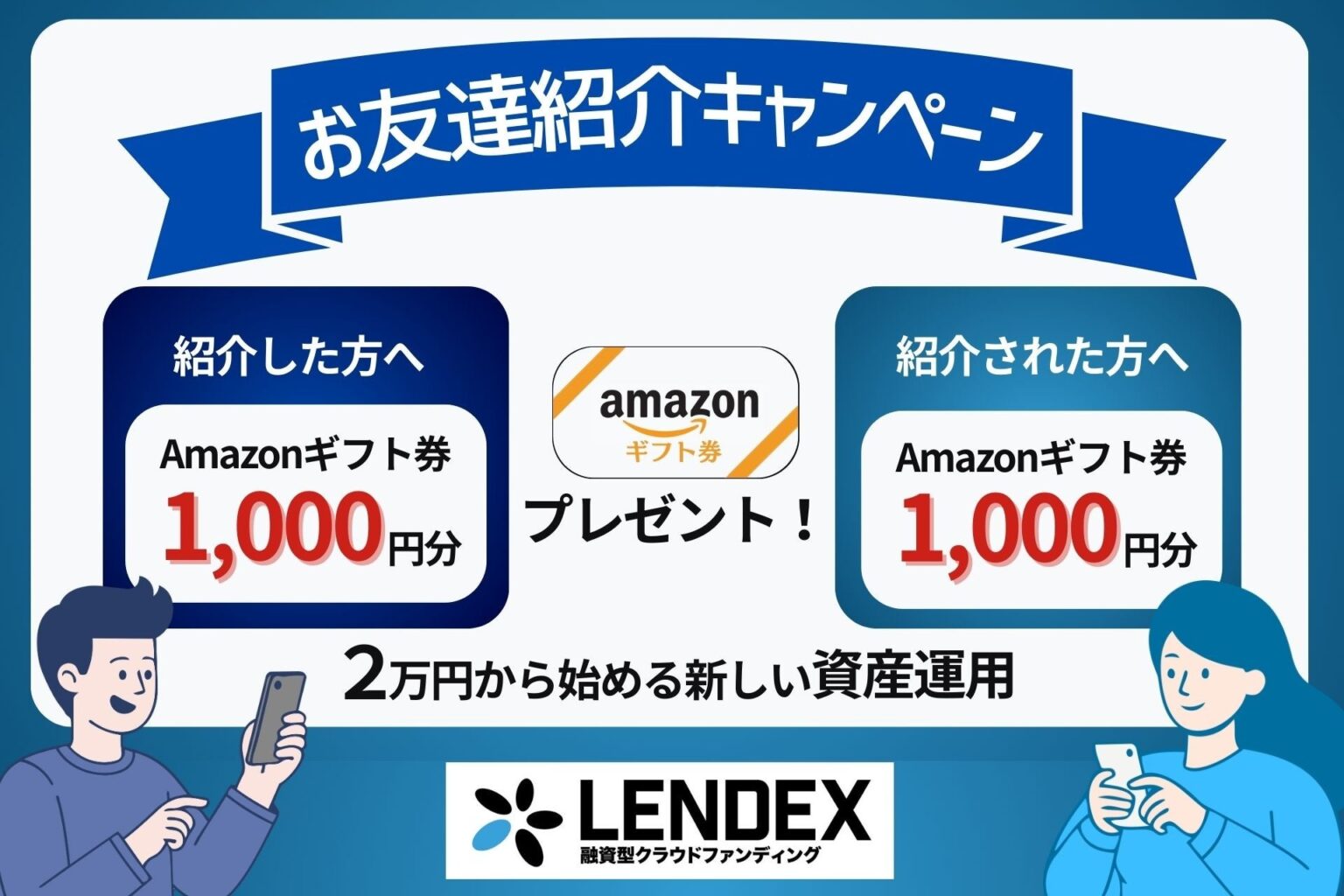 融資型クラウドファンディング「レンデックス(LENDEX)」は、2026年3月24日0時から4月19日23時59分まで「Amazonギフト券がもらえる!お友達紹介キャンペーン」を実施します。紹介者は1人紹介するごとに1,000円分、紹介される側も条件達成で1,000円分が付与されます。紹介は1人あたり最大10名までです。