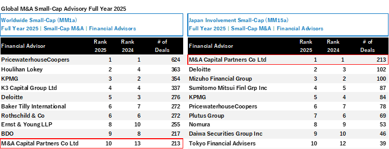 世界順位では「Worldwide Small-Cap」で10位、「Worldwide Mid-Market」で13位に入り、2年連続で世界ランキングにも名を連ねました。対象はそれぞれ「Global M&A Small-Cap Advisory Full Year 2025」「Global M&A Mid-Market Advisory Full Year 2025」で、いずれもLSEG作成データに基づきます。