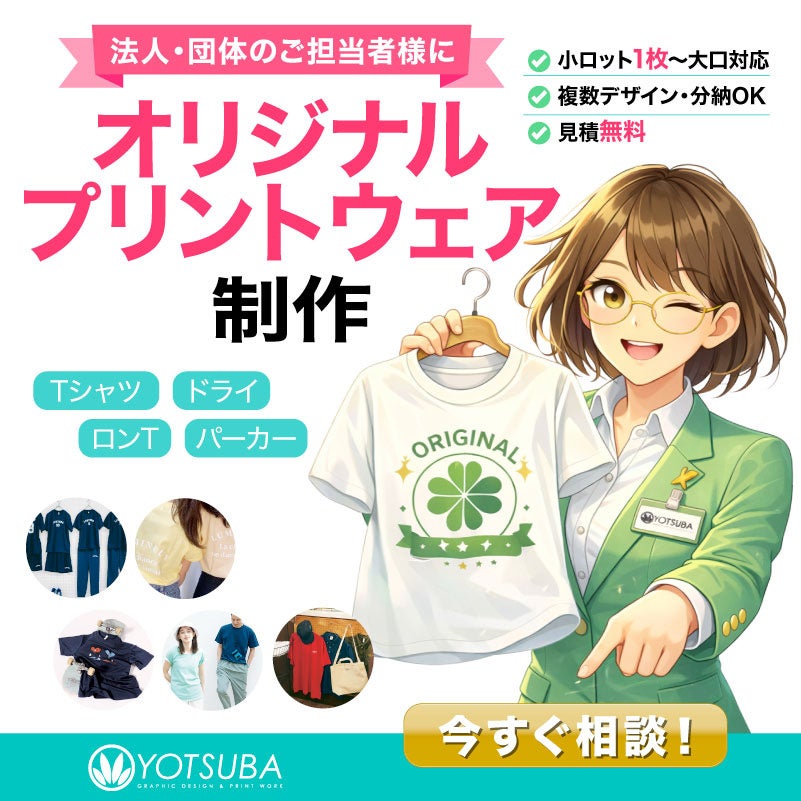 ヨツバ印刷(運営:株式会社MAW、大阪市中央区)は2026年2月24日、法人・団体がオリジナルプリントウェアを選定・発注しやすくする制作ガイド(コンテンツページ)を公開しました。対象はTシャツやドライTシャツ、クラT、ロンT、トレーナー、パーカーで、最小ロットは1枚、100枚以上の大口にも対応するとしています。