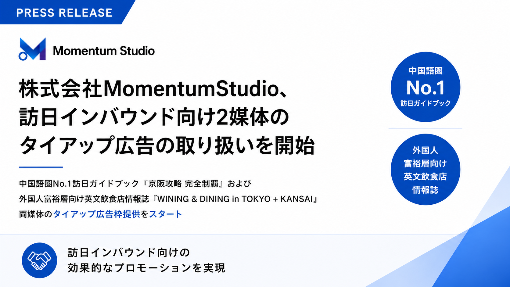 株式会社MomentumStudio(東京都港区)は2026年4月29日、訪日外国人(インバウンド)と日本在住外国人の富裕層を狙う企業向けに、中国語圏ガイドブック「京阪攻略 完全制霸」と英文飲食店情報誌「WINING & DINING in TOKYO + KANSAI」の記事広告枠の取り扱いを始めました。訪日客は2025年度に4,268万人(前年比115%)で過去最高となっています。