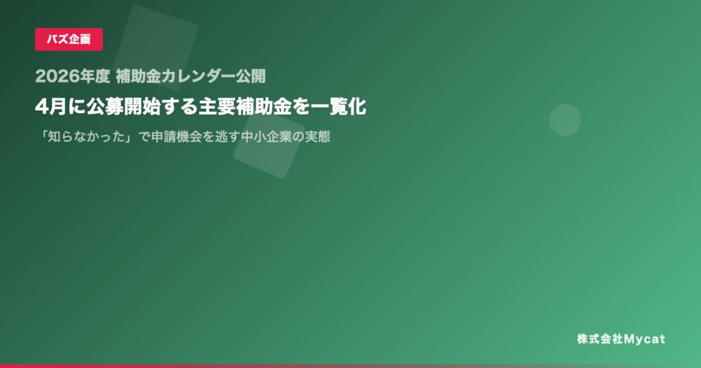 株式会社Mycat(東京都目黒区)が運営するAI事業計画書自動生成サービス「補助金AI」は2026年3月20日、2026年度に公募開始が見込まれる主要補助金のスケジュールを独自に集計した「2026年度 補助金カレンダー」を公開した。中小企業庁のデータでは、公募開始から申請締切までの平均期間は約45日としている。