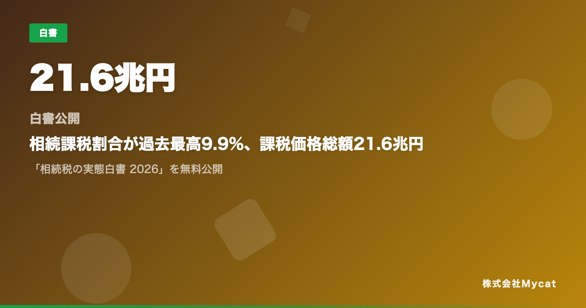 株式会社Mycat(東京都目黒区)は2026年3月21日、国税庁の最新統計を分析したレポート「相続税の実態白書 2026」を無料でダウンロード公開しました。国税庁の「令和5年分 相続税の申告事績の概要」では、相続税の課税割合は9.9%で、課税価格の合計は21兆6,335億円、被相続人1人あたりの課税価格は約1億4,700万円とされています。