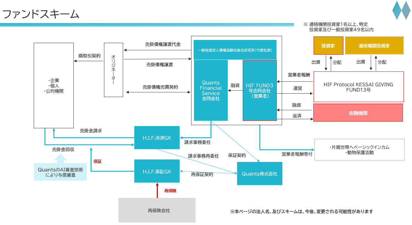 Quants株式会社(東京都新宿区)の独自AIで選定した売掛債権などに投資する「HIF KESSAI GIVING FUND13号」が2026年1月1日にローンチし、開始時運用額は13億円です。運用期間は1年で、申込単位は1口500万円以上としています。