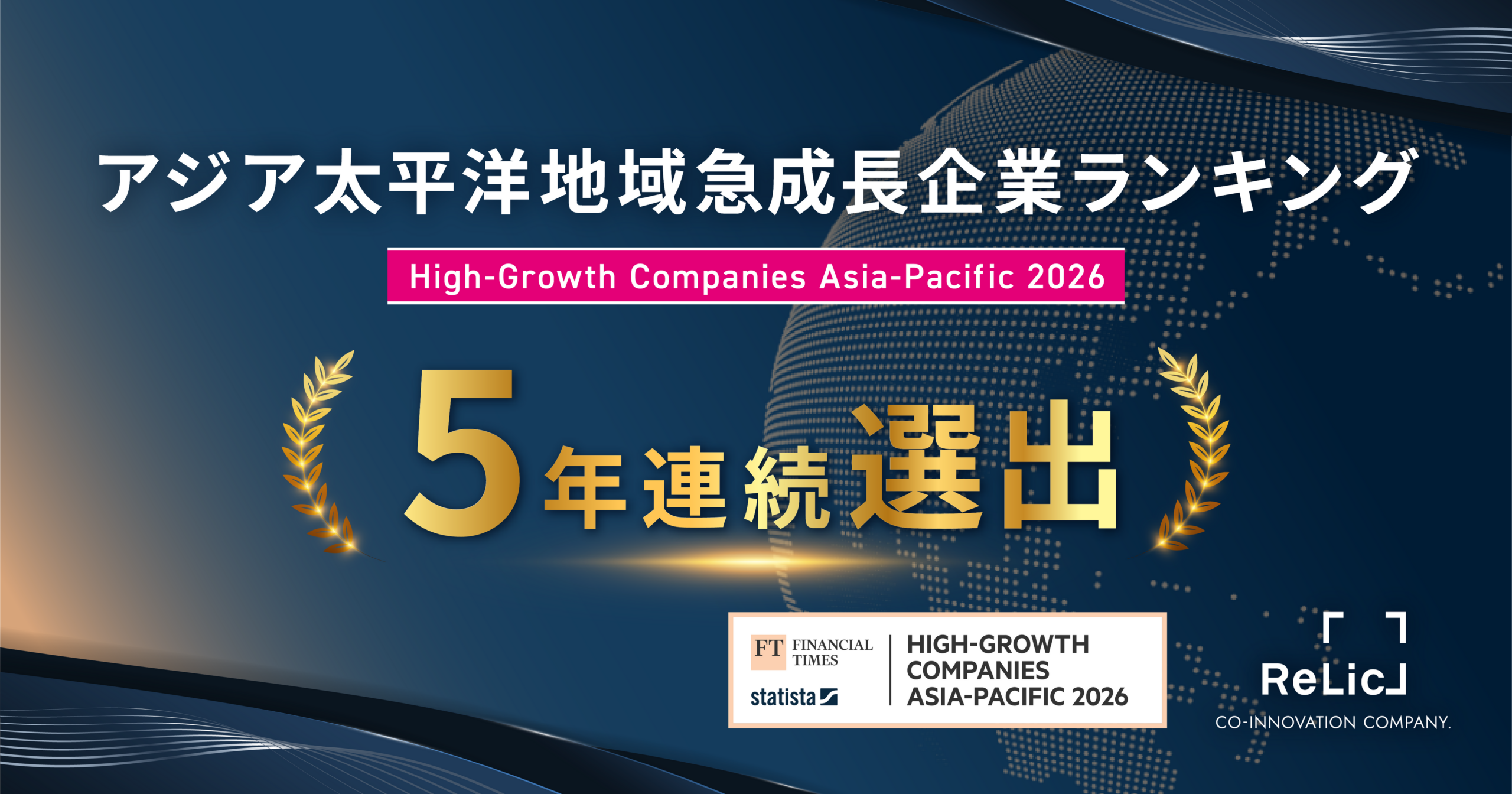 株式会社Relic(東京都渋谷区)は3月17日、英Financial Times社と独Statista社が共同で実施する「FT ranking: High-Growth Companies Asia-Pacific 2026」に5年連続で選出されたと明らかにしました。順位はアジア太平洋地域で281位、IT & Software部門で53位です。国内では急成長企業35位、同部門12位でした。