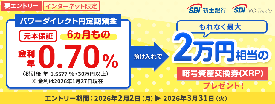 SBI新生銀行(東京都中央区)はSBI VCトレードと、円定期預金「パワーダイレクト円定期預金(6カ月もの)」に30万円以上預け入れた人全員へ、預入合計額に応じて最大2万円相当の暗号資産交換券(XRP)を進呈するキャンペーンを2026年2月2日に始めます。対象商品の金利は年0.70%(税引前、2月2日現在)です。