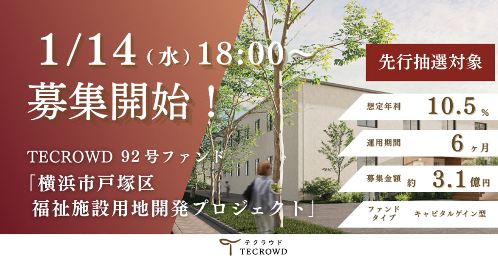 不動産クラウドファンディング「TECROWD」は、国内キャピタルゲイン型の「TECROWD92号ファンド(横浜市戸塚区 福祉施設用地開発プロジェクト)」の募集を2026年1月14日18時に始めます。想定年利は10.5%で、1口10万円から投資でき、募集金額は約3.1億円です。一般募集期間は1月14日から1月20日、運用期間は1月21日から7月20日で、償還・配当日は8月10日を予定しています。投資対象は横浜市戸塚区戸塚町で計画する福祉施設(複合型ホーム)の用地開発で、運用中は施設の設計と建築確認の取得までを進める計画です。複合型ホームは障がい者グループホーム(日中サービス支援型)と医療対応ナーシングホームを併設し、いずれも24時間365日の支援体制を想定します。収益・償還は短期のキャピタルゲイン(売却益)を狙う設計で、設計完了と建築確認取得後に再組成ファンドを組成して償還する方法、または第三者へ売却して償還する可能性があります。再組成ファンドは建築後の売却型(キャピタルゲイン)か賃貸運用型(インカムゲイン)のいずれかを想定します。損失リスクを抑える仕組みとして、投資家の優先出資に対し、運営側が劣後出資を行う優先劣後構造を採用し、損失が出た場合はまず劣後出資分が負担するとしています。今後は、建築確認取得後の資金計画と出口(再組成か売却)の選択が、運用結果を左右する見通しです。