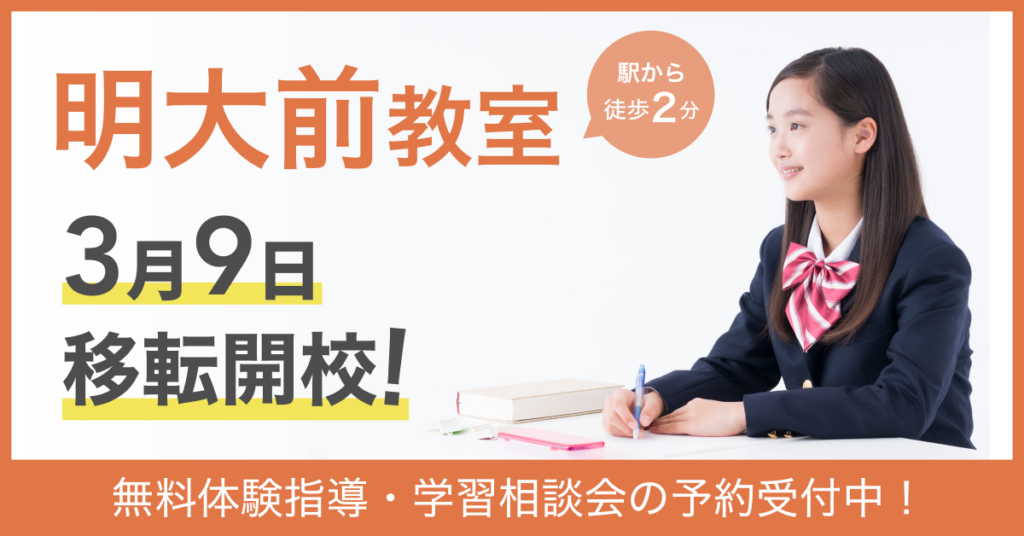 中高一貫校専門の個別指導塾「WAYS明大前教室」(東京都世田谷区)は、2026年3月9日(月)に教室を拡大移転し、同週の3月14日(土)から春期講習を始めます。新教室は〒156-0043 東京都世田谷区松原1-38-28 松原片桐屋ビル2階で、明大前駅から徒歩2分です。