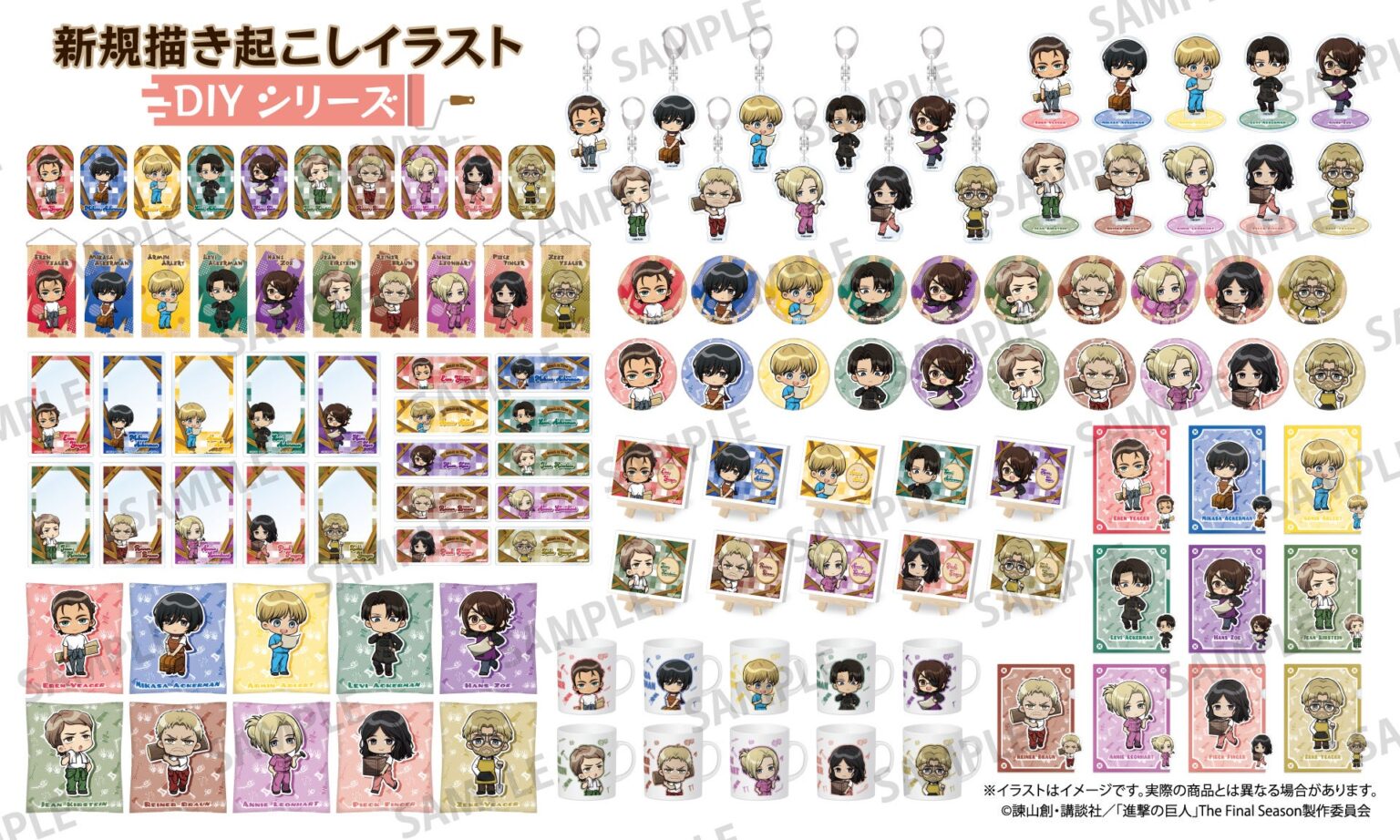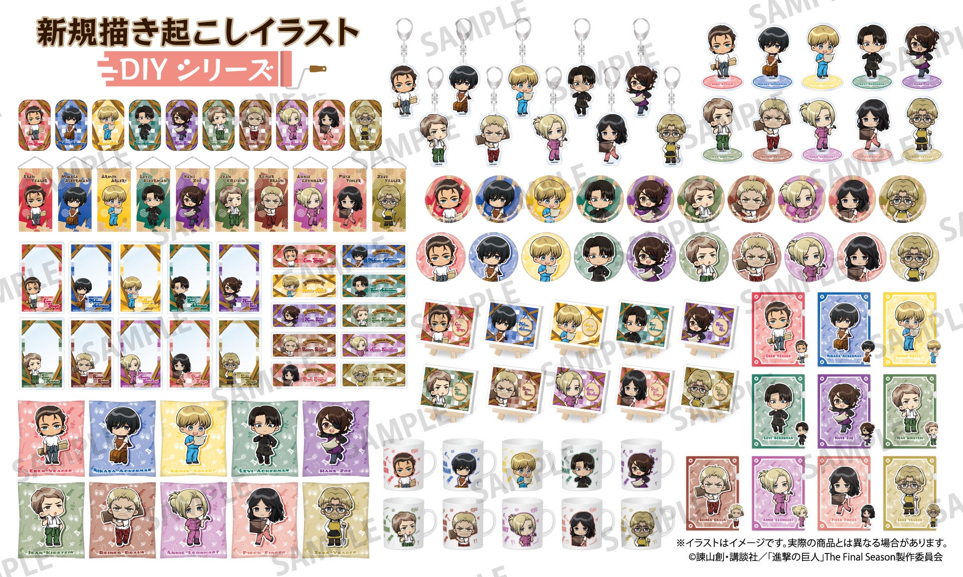 TVアニメ「進撃の巨人」を題材にした新作グッズ「ミニキャラDIYシリーズ」の予約受付が、ECサイト「LD-LIBERTAS DREAM- オンラインストア」で始まりました。エレンやミカサら全10キャラクターが、DIY(自分で作る日曜大工)を楽しむ姿を描いたオリジナルイラストで、缶バッジからクッションまで13種、価格は税込550〜4,180円です。予約期間は2026年1月6日23時59分まで、出荷は2026年3月中の随時発送予定とされています。