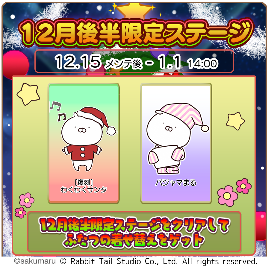 スマホ向けクッキングゲーム『うさまるキッチン』で、12月後半限定ステージが2025年12月15日メンテナンス後から2026年1月1日14時まで開催します。対象ステージのクリア報酬として、復刻着せ替え「わくわくサンタ」と新規着せ替え「パジャマまる」を獲得できます。