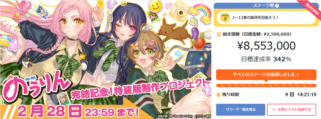 アニメイトが運営するクラウドファンディングサービス「ソレオス」で実施中の「『のうりん』完結記念!特装版制作プロジェクト」が第2目標の850万円を達成し、クラウドファンディング限定で紙書籍『のうりん』1巻~13巻を特別仕様で復刊することが決まりました。受付は2026年2月28日23時59分まで続きます。