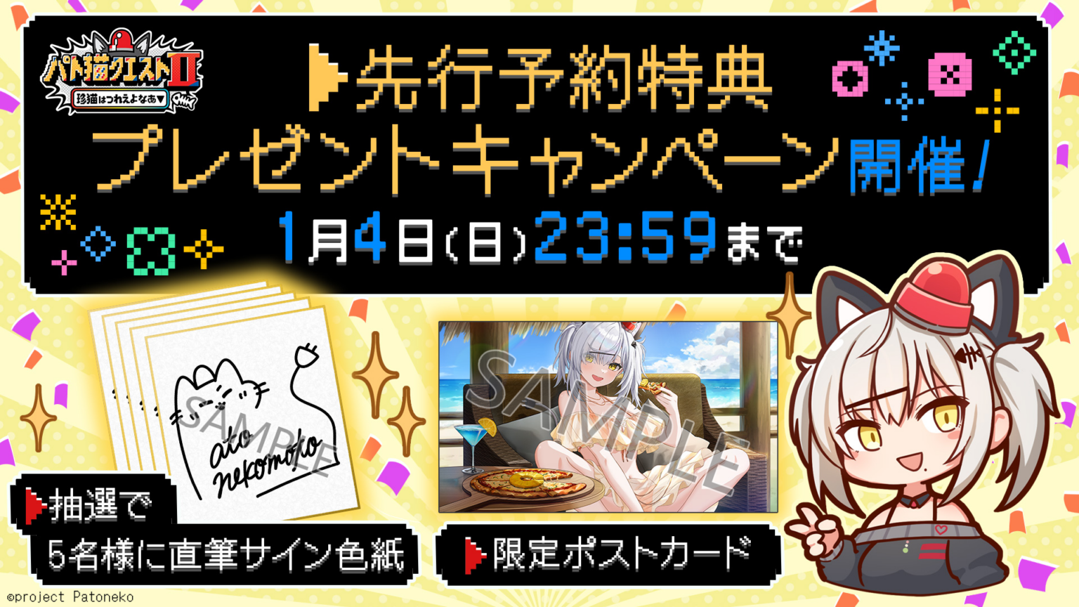 VTuber「猫元パト」が主役のフルボイスADV『パト猫クエストⅡ 珍猫はつれえよなあ』で、2026年1月4日23:59までに「珍猫セット」(12,800円・税込)を予約購入すると、購入者全員に限定ポストカードが付くキャンペーンが始まりました。加えて、直筆サイン色紙が抽選で5名に当たります。販売はラビットフット公式BOOTHで、特典は商品1個につきポストカード1枚。すでに「あなただけセット」「珍猫セット」を購入済みの人も対象です。作品は2026年2月26日発売予定で、猫元パトが本人役として出演し、全編フルボイスで展開します。対応はWindows(Steam/DLsite)やNintendo Switchが予定され、iOS/Android、PS4/PS5にも対応予定とされています。予約特典で先行需要を喚起しつつ、発売に向け認知拡大が進む見通しです。