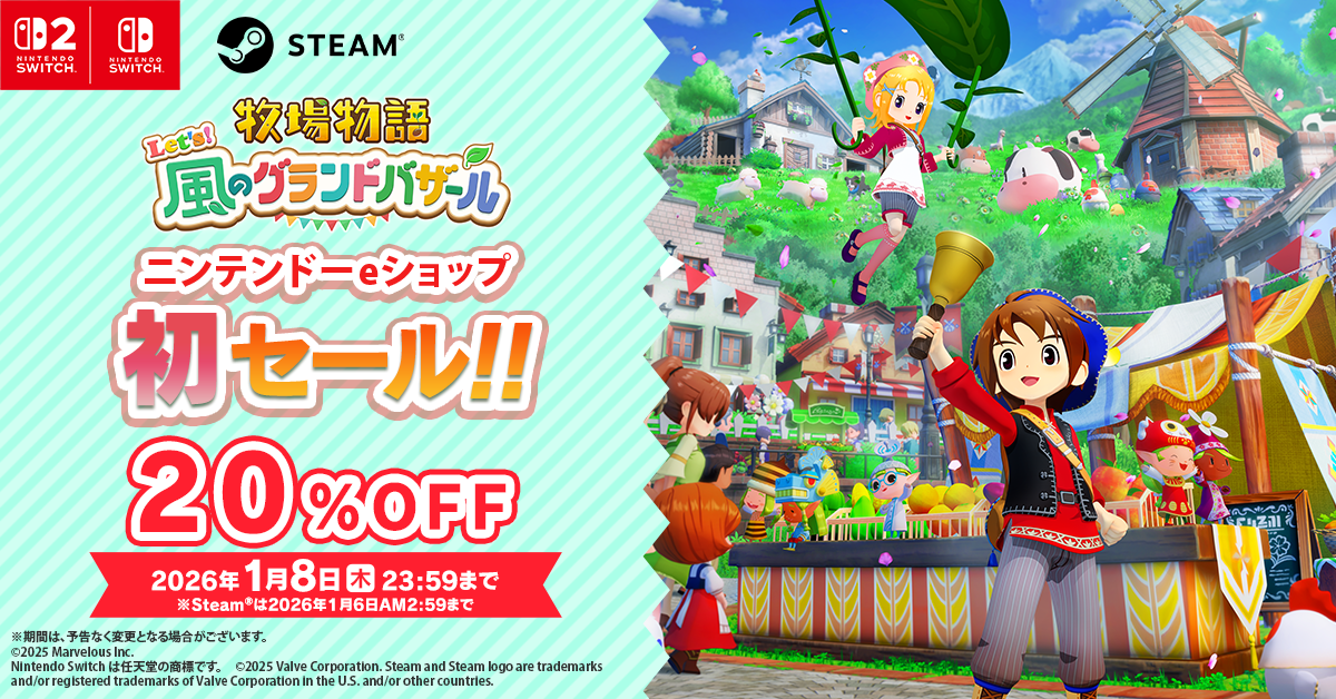 マーベラスは生活ゲーム『牧場物語 Let’s!風のグランドバザール』のNintendo Switch版およびNintendo Switch 2 Editionについて、ニンテンドーeショップで初のセールを開始しました。期間は2025年12月19日0:00から2026年1月8日23:59までで、本編と各種DLCが20%OFFになります。