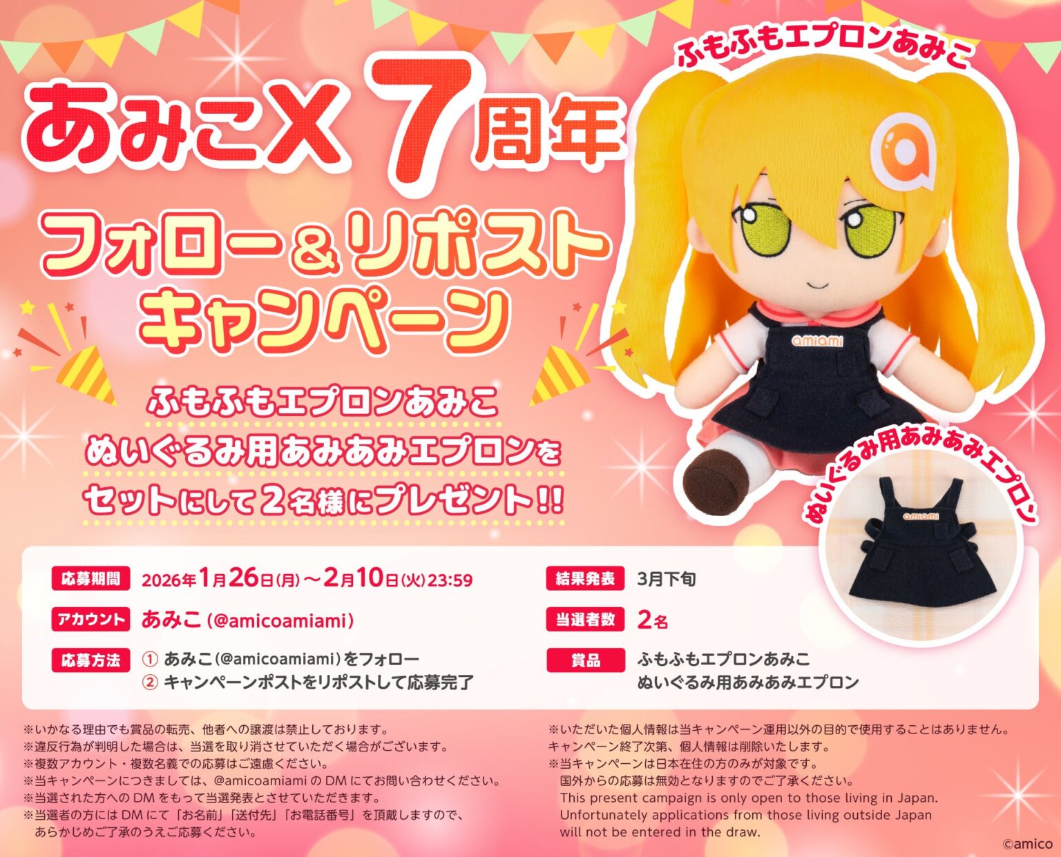 ホビーショップ「あみあみ」の看板娘「あみこ」は、Xアカウント7周年を記念し、フォロー&リポストキャンペーンをXで始めました。期間は2026年1月26日から2月10日23時59分(日本時間)までで、抽選2名に「ふもふもエプロンあみこ」と「ぬいぐるみ用あみあみエプロン」をセットで贈ります。