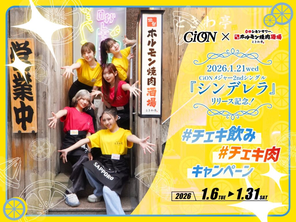 GOSSOが展開するときわ亭は、5人組アイドル「CiON」との期間限定企画「#チェキ飲み#チェキ肉キャンペーン」を2026年1月6日〜31日に池袋西口、新宿三丁目、名駅三丁目、阪急(梅田)東通りの4店舗で実施します(梅田のみ1月8日開始)。対象店舗で、Xに指定条件の投稿をして提示するか、CiONメンバーが選んだおすすめ「#チェキ肉」コラボメニューを注文すると、限定アクリルコースター(全12種・ランダム)が1来店につき1枚配布されます。店内の卓上サーバーから自分で注ぐ「0秒レモンサワー」は60分550円(税込)で、待ち時間なしを売りにします。アプリ会員数は37万人超とし、推し活需要を取り込む狙いです。期間中はCiONメンバーが来店するサプライズ企画も予定され、告知はときわ亭またはCiON公式Xで行うとしています。