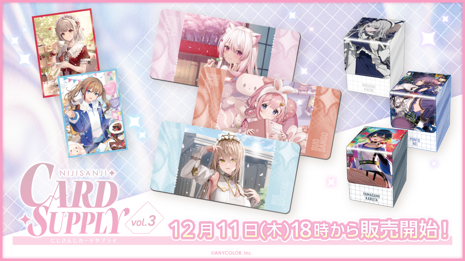 VTuberグループ「にじさんじ」は、カードゲーム用グッズ「にじさんじカードサプライ vol.3」を2025年12月11日(木)18時からオンラインで販売します。カードスリーブ(各1,400円)、デッキケース(各3,500円)、大判ラバーマット(各3,200円)の3種を展開し、それぞれ8種類ずつ用意します。