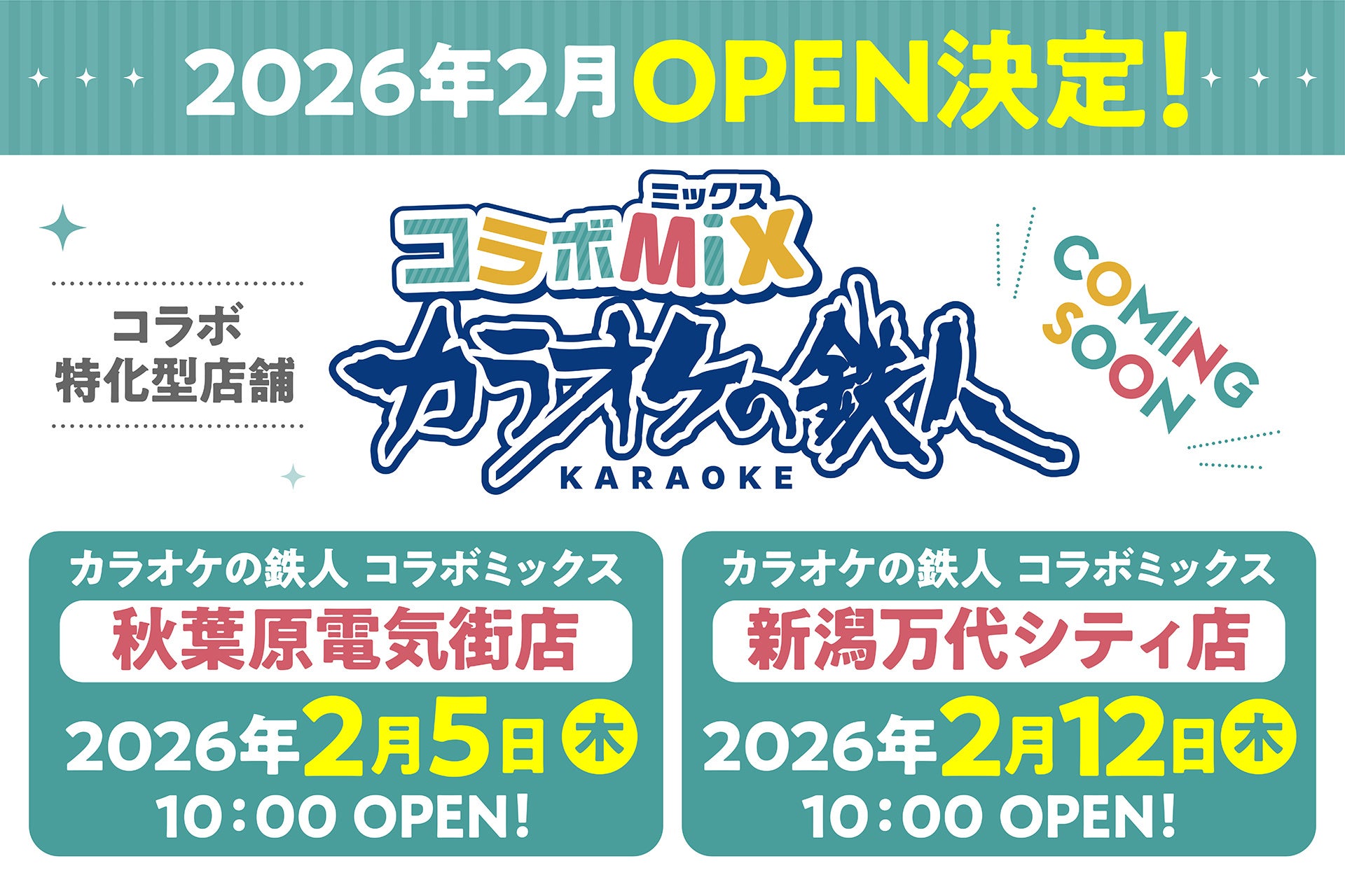 カラオケチェーン「カラオケの鉄人」は、コラボレーション常設型の新業態「コラボミックス」を東京・秋葉原電気街と新潟・万代シティに出店し、2026年2月5日と2月12日に順次開業します。運営は鉄人エンタープライズで、同社による「カラオケの鉄人」店舗数は2026年1月時点で31店舗です。