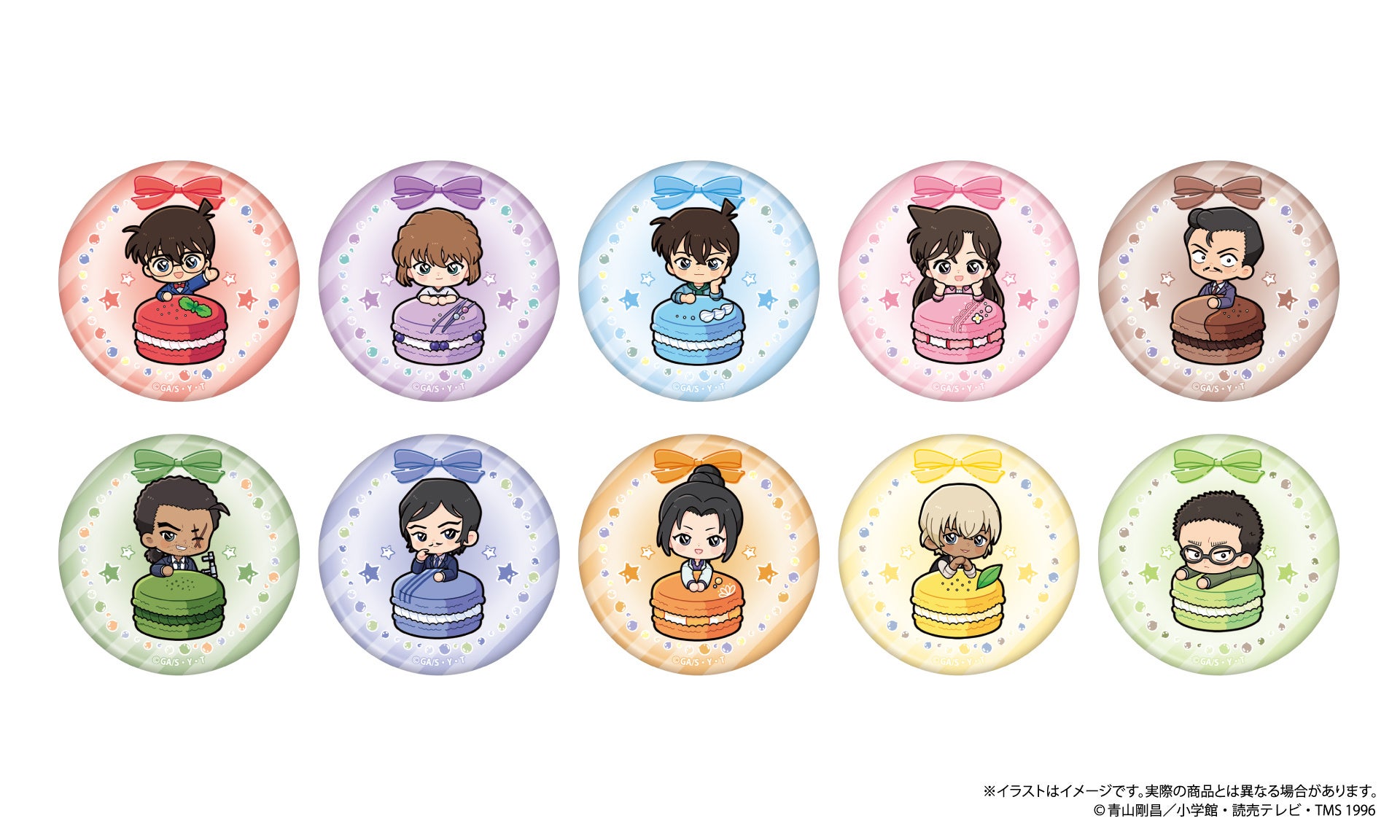 今回のシリーズは「スイーツから、ひょっこり登場♪」をテーマにしたミニキャラ(SD=デフォルメキャラクター)描き起こしイラストが特徴です。展開商品は、丸型缶バッジ(各550円、直径約57mm)や長方形型缶バッジ(各715円、約70×H44mm)のほか、ガラスマグネット(各770円、直径約40mm)などを用意します。