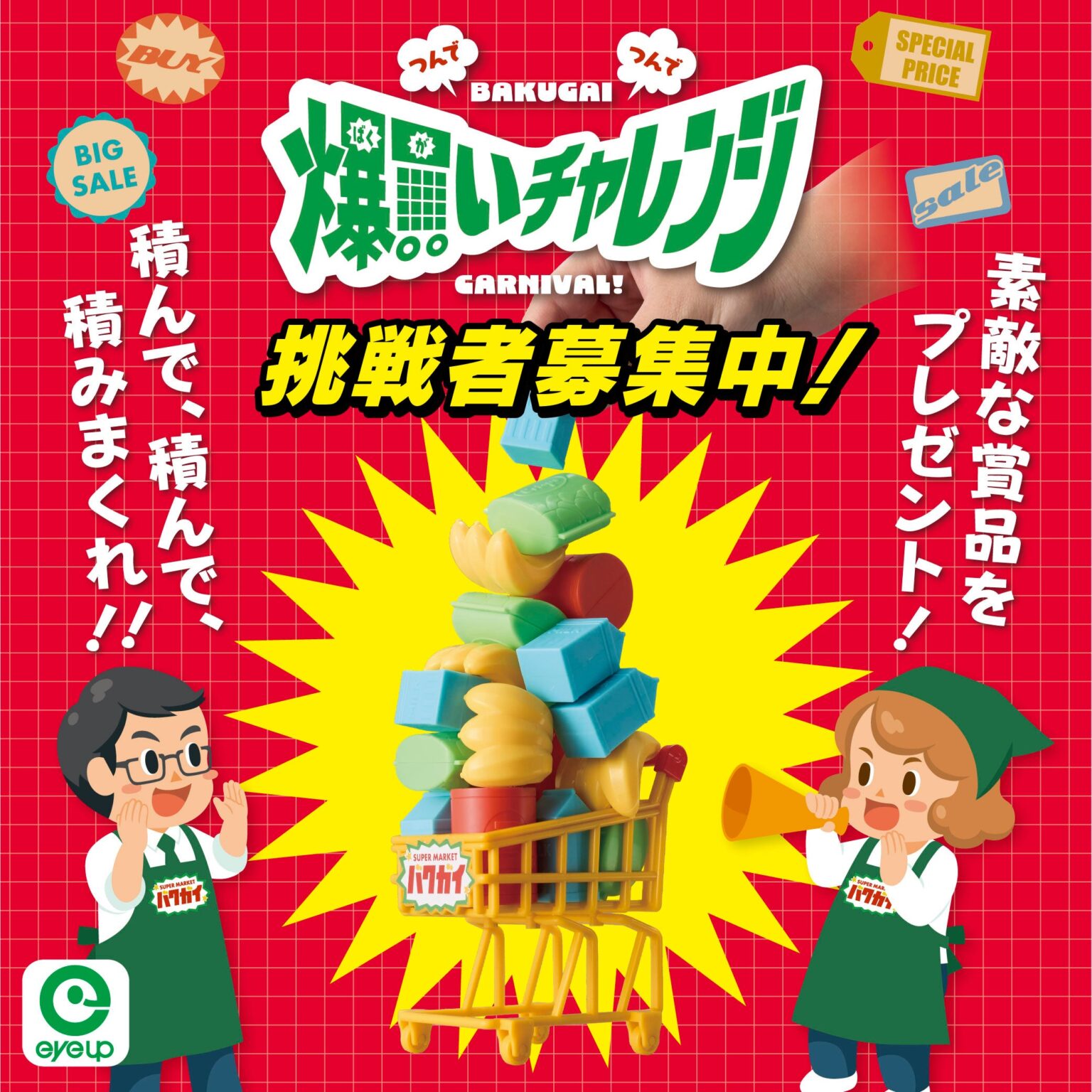玩具メーカーの株式会社アイアップは、ショッピングカート型バランスゲーム「爆買いカーニバル」を使い、商品パーツをどれだけ高く積めるかを競うSNS連動企画「爆買いチャレンジ」を実施しています。参加者の中から毎月2人に、ゲームに付属するショッピングカートと商品パーツ一式が抽選で当たります。