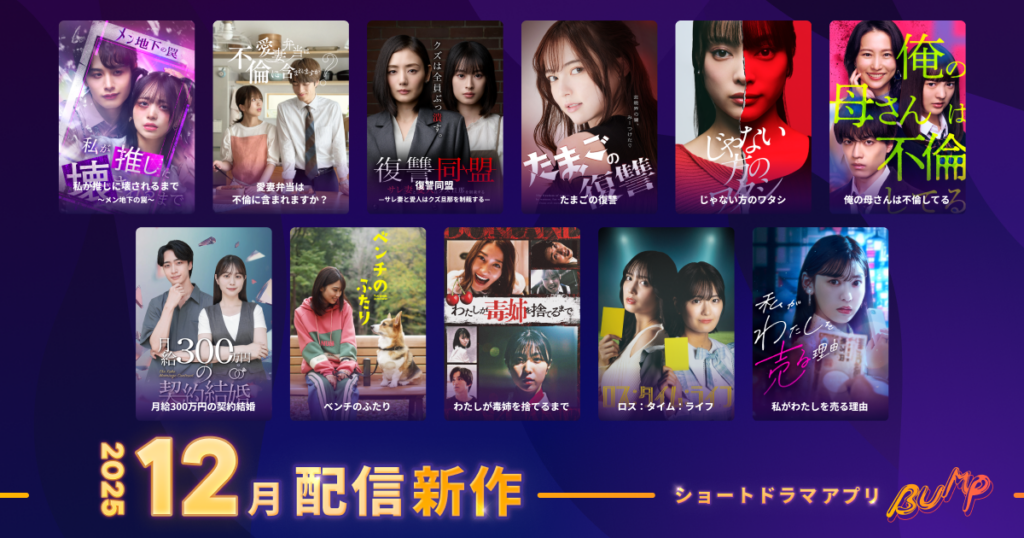 ショートドラマアプリ「BUMP」で、2025年12月公開の新作ショートドラマ11作品の配信が始まりました。提供するemole(本社・東京都目黒区)は、1話1~3分の短尺に、多ジャンルの新作を一挙投入します。新作は、地下アイドルをめぐる課金・依存の闇、弁当の付箋から揺れる夫婦関係、不倫・復讐や芸能界を舞台にした制裁劇、ドッペルゲンガーの入れ替わりホラー、兄妹が家庭崩壊の危機に向き合う物語、借金返済のための契約結婚、愛犬と公園で展開するコメディ、毒姉への制裁、さらに『ロス:タイム:ライフ』の令和版復活(二本立て)などをそろえます。BUMPは「待つと無料」で視聴でき、1話97円(税込)の課金や広告視聴にも対応します。総ダウンロード数は250万回超(2025年9月時点)で、短尺ドラマ需要の取り込みが続く見通しです。