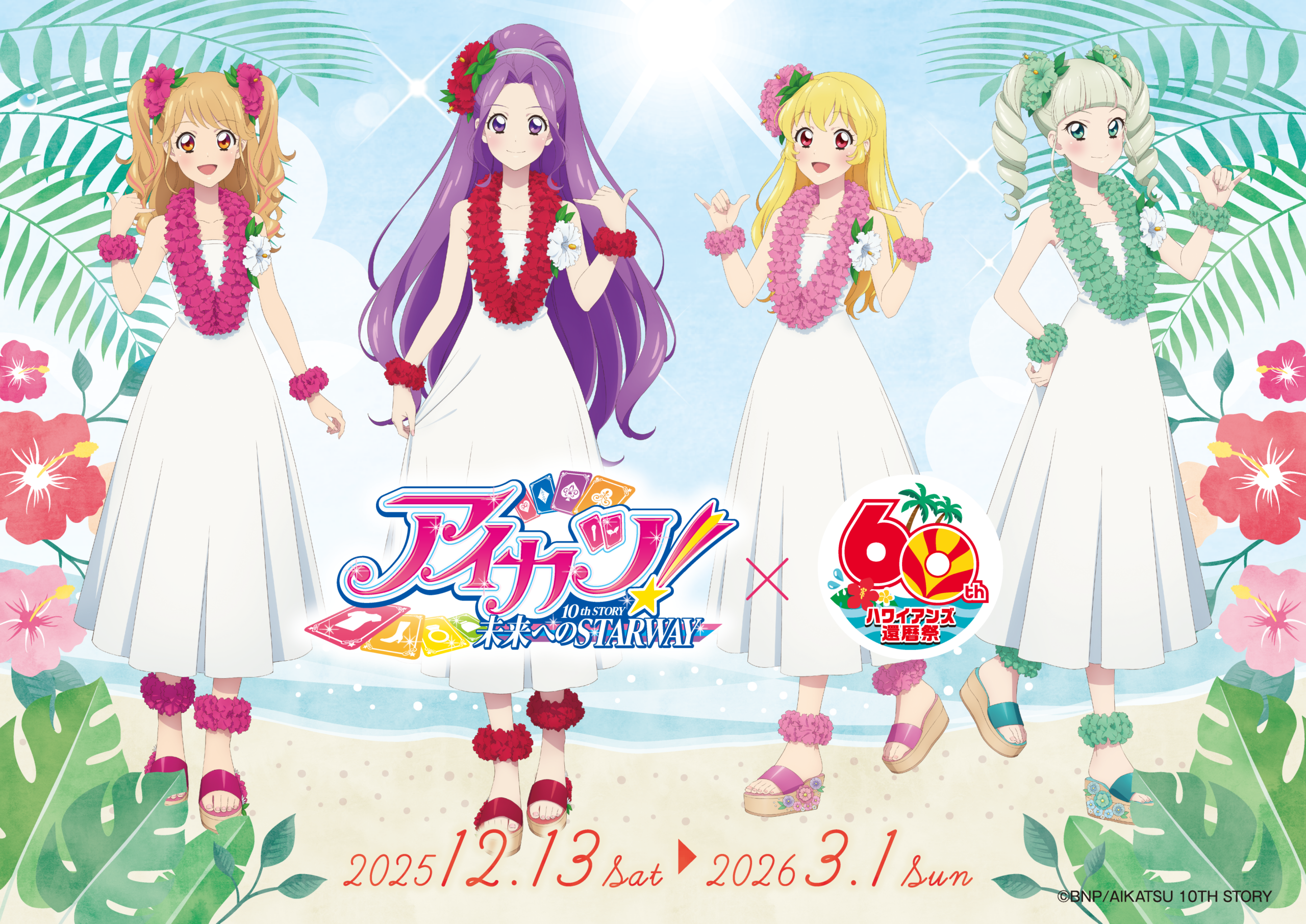 福島県いわき市のスパリゾートハワイアンズは、創業60周年を記念し、アニメ「アイカツ!」とのコラボイベントを2025年12月13日(土)~2026年3月1日(日)まで開催します。期間中は特別ノベルティ付き入場券を販売し、大人平日3,870円・土日祝4,420円、小学生平日2,550円・土日祝3,100円など専用料金を設定します。