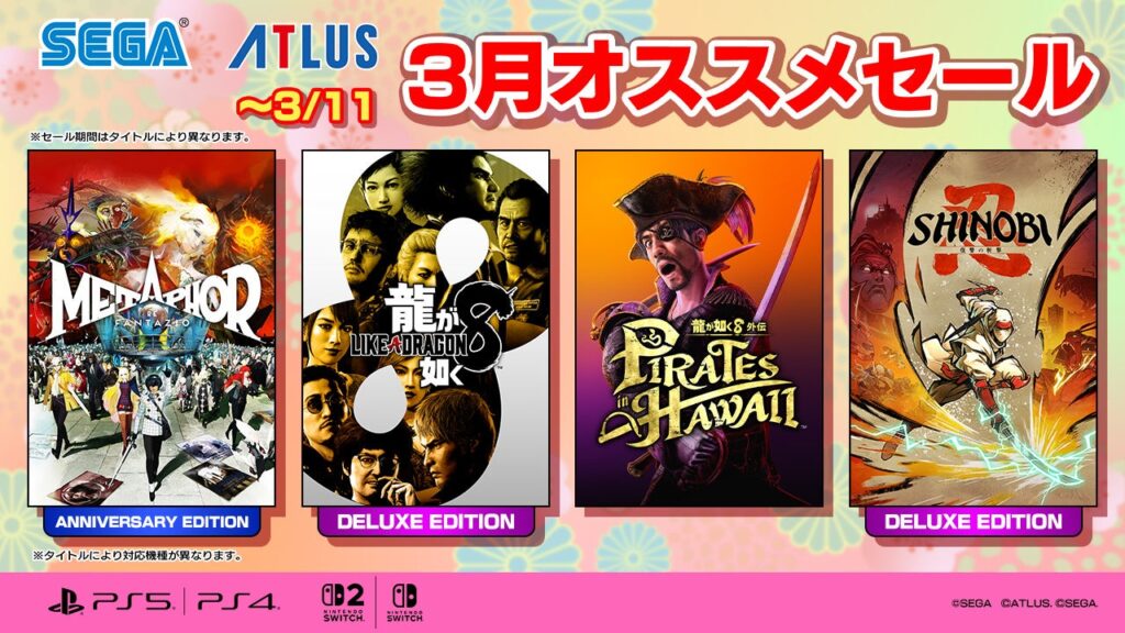セガは2月25日12時27分から3月11日まで、PlayStation Storeとニンテンドーeショップで「セガ 3月オススメセール」を実施し、対象のPS5/PS4/Nintendo Switch/Nintendo Switch 2向けタイトルを期間限定の特別価格で販売します。