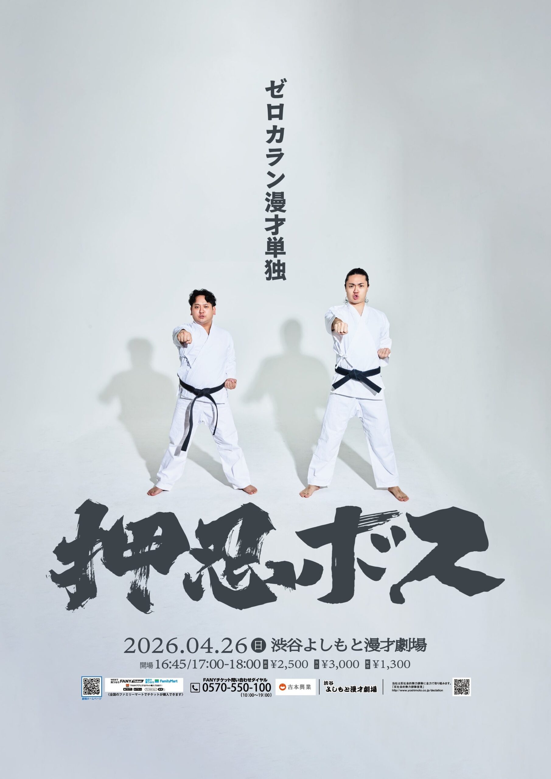 吉本興業(東京都新宿区)所属のお笑いコンビ「ゼロカラン」(ワキユウタ、たいが)は2026年4月26日(日)、渋谷よしもと漫才劇場で2度目の単独ライブ『押忍ボス』を開きます。16時45分開場、17時開演、18時終演で、構成は全編「漫才のみ」です。