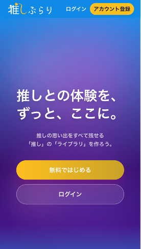 推しぶらりは、推しに関する情報や思い出を記録してコレクションできるほか、コレクションを他者と共有する機能、推しに関連する場所を訪れて体験を発見する機能を備えます。エンタメ体験を「保管・共有・体験」する場として設計されています。