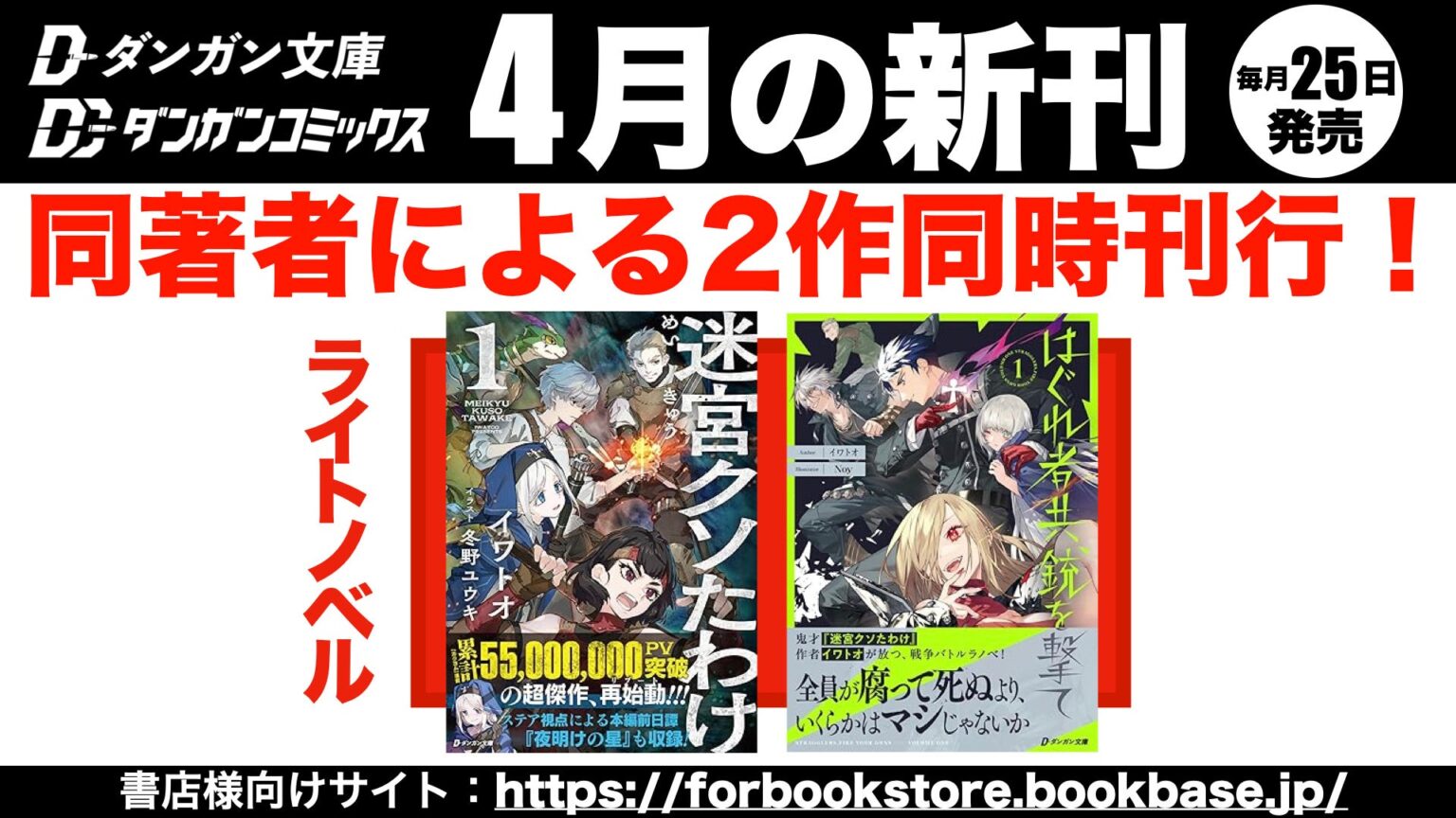 株式会社BookBase(大阪市西区)は、ライトノベルレーベル「ダンガン文庫」の4月新刊として、『迷宮クソたわけ 1』の紙書籍版と、同著者による新シリーズ『はぐれ者共、銃を撃て 1』を2026年4月25日に全国の書店で同時発売します。いずれもB6判で、価格は各1,650円(税込)です。