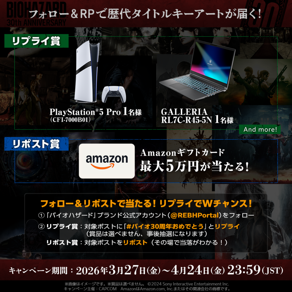 カプコンは「バイオハザード」シリーズ30周年を記念し、ブランド公式X(@REBHPortal)で抽選キャンペーンを2026年3月27日から4月24日23:59まで実施します。リポスト参加はその場で抽選結果が分かり、賞品はAmazonギフトカード5万円分(1人)、5,000円分(10人)、1,000円分(200人)です。