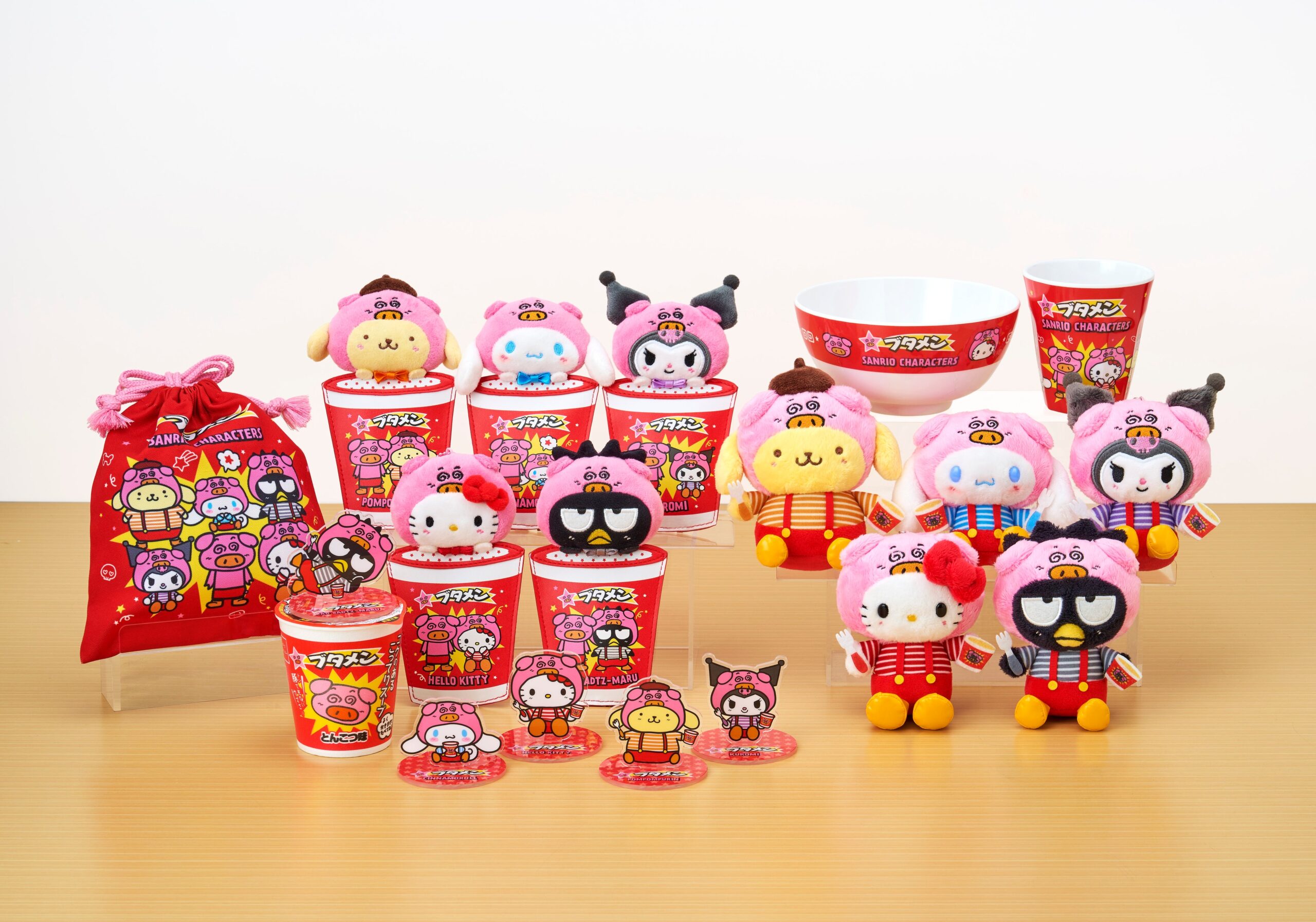 商品は、ブタメンくんになりきったハローキティ、ポムポムプリン、シナモロール、クロミ、バッドばつ丸などのオリジナルデザインで展開します。全アイテムに「ブタメン(とんこつ味)」1個と、キラキラシール1枚(全10種、絵柄は選べません)を同梱し、ホワイトデー時期のギフト需要を狙います。
